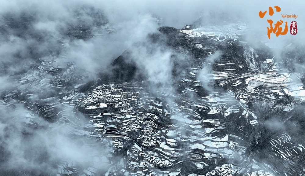 雪后梯田云遮霧蓋,黑白分明的線條優(yōu)雅而生動(dòng),展現(xiàn)出別樣的韻味。