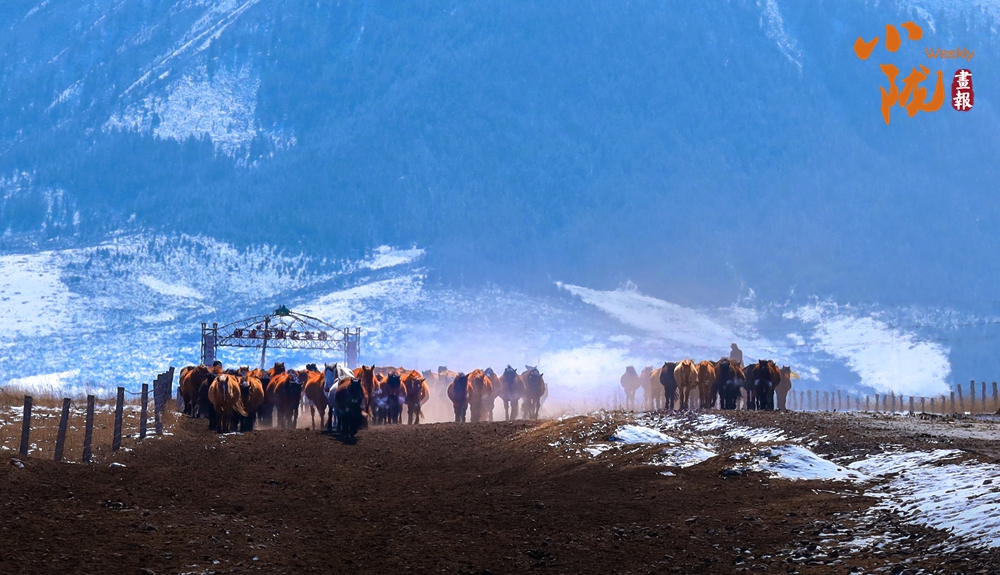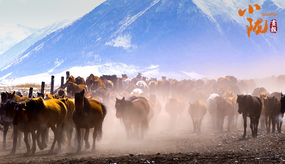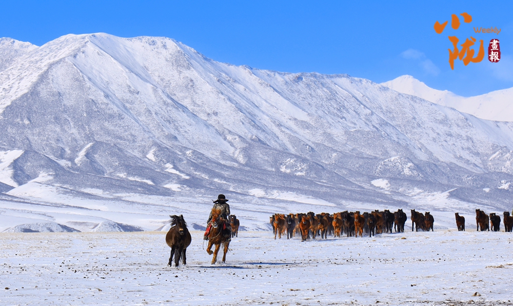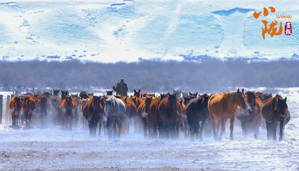 牧民策馬揚(yáng)鞭,驅(qū)趕著馬群在積雪中飛馳。駿馬矯健的身姿如靈動音符,奏響春日里激昂旋律。