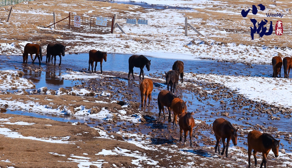 一場春雪后,山丹馬場天空湛藍(lán),祁連山巍巍壯觀。成群的駿馬在這片廣袤無垠的草原上或低頭吃草,或奔跑嬉戲,成為雪地里一道靚麗的風(fēng)景。