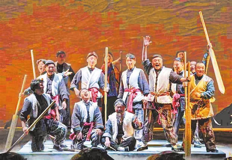 《大河東流》的題材構(gòu)成呈現(xiàn)出鮮明的復合型特征,其核心在于將黃河文化、甘肅地域特色、抗戰(zhàn)歷史與家族倫理熔鑄為一體。劇中,黃河既是地理坐標,更是文化符號。從開場的“黃河號子”到貫穿全劇的羊皮筏子,從金城關(guān)、黃河鐵橋的舞臺化呈現(xiàn)到地游子步、風擺柳等隴劇特有的身段程式,黃河的自然景觀與人文精神被轉(zhuǎn)化為舞臺符號。