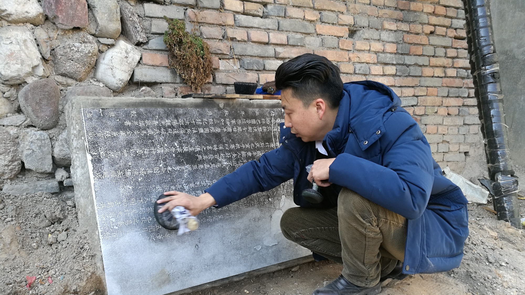 圖為張欽仲發(fā)現《重修平涼城隍廟碑記》并制作拓片(崆峒區(qū)融媒體中心供圖)
