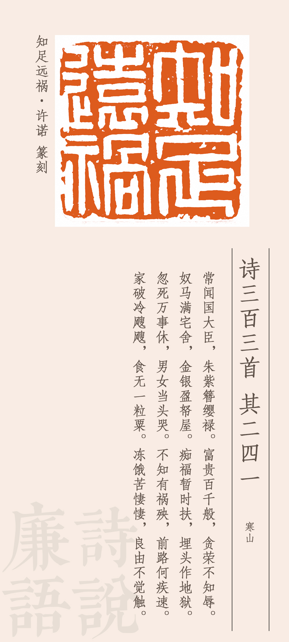 這首詩是諷刺高官貪圖富貴、聚斂財物的。他說,有些國之大臣,穿戴尊榮,好不威風,享受千般榮華富貴,卻一點兒都不顧及廉恥榮辱,家中擁有大量駿馬奴仆,屋子里堆滿金銀財寶,自以為這是在享福,其實是在給自己挖墳墓地獄。一旦死去,萬事皆休,富貴是無法永久保留的。如果因貪腐而遭受禍殃,那下場就會很慘。家破人亡,挨凍受餓,凄風苦雨,苦不堪言。最后一句卒章顯志:之所以會有這樣的遭遇和結局,是因為沒有悟透取禍的原因。這個原因從前面所述來看,就是太貪婪、不知足。