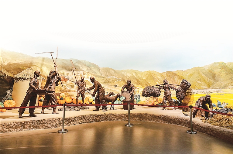 南泥灣大生產(chǎn)紀念館內(nèi)的雕塑作品。中國共產(chǎn)黨領(lǐng)導(dǎo)抗日軍民自力更生、艱苦奮斗,把南泥灣變成“陜北的好江南”。新華社記者 樊雨晴 攝