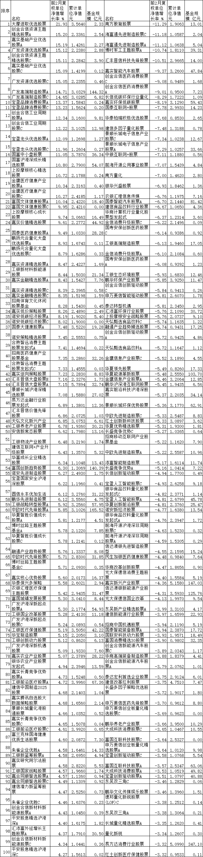 前2月普通股票型基金漲跌幅前100名