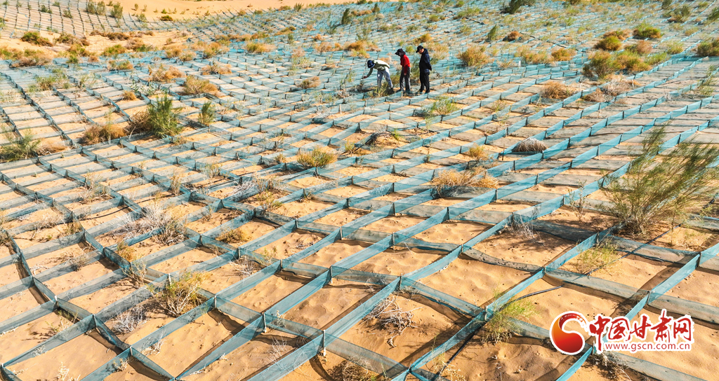 連日來(lái),甘肅省張掖市臨澤、高臺(tái)北部荒漠區(qū)防沙治沙區(qū)內(nèi),群眾在防沙治沙工程現(xiàn)場(chǎng)共同壓沙障、栽梭梭、澆水管護(hù)、筑牢“阻沙網(wǎng)”,塑緊“防沙衣”,連綿起伏的沙漠上,麥草方格沙障一望無(wú)際,栽植的梭梭等植物迎風(fēng)挺立,煥發(fā)蓬勃生機(jī)。