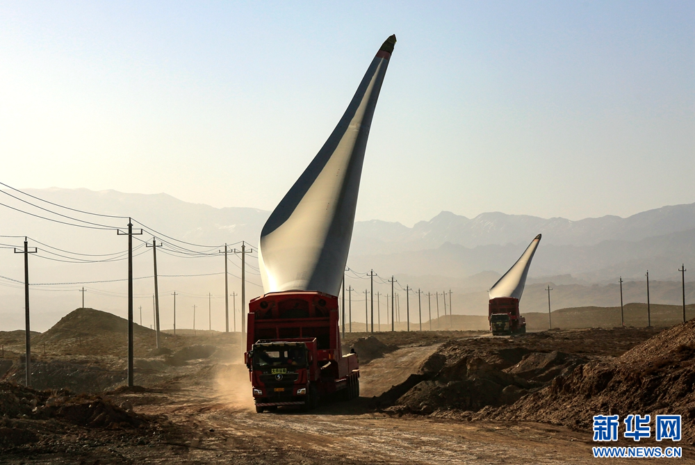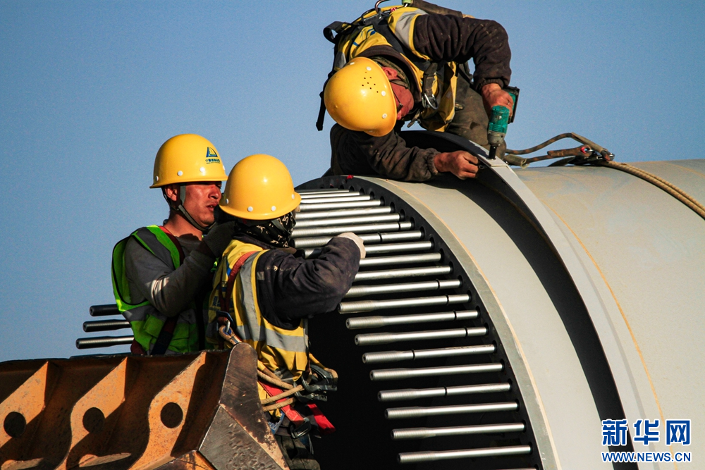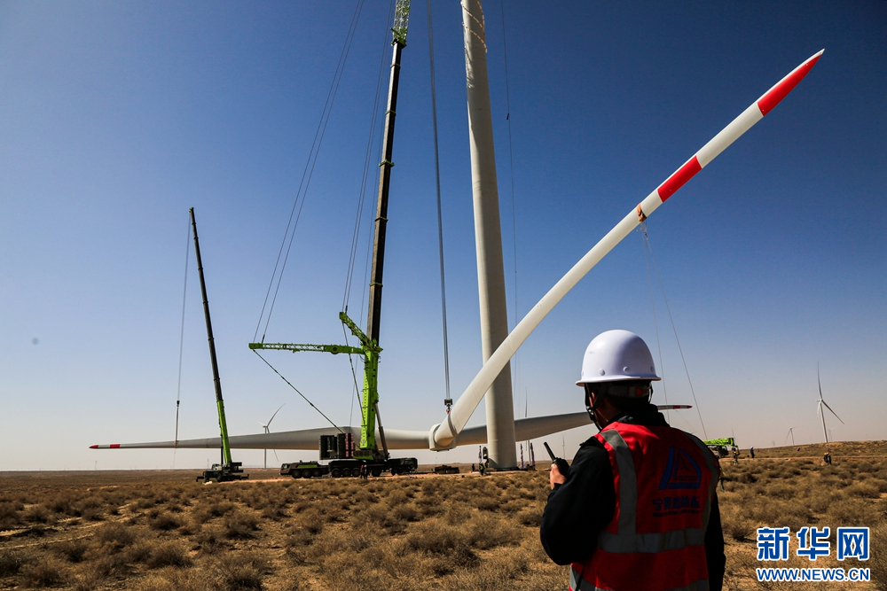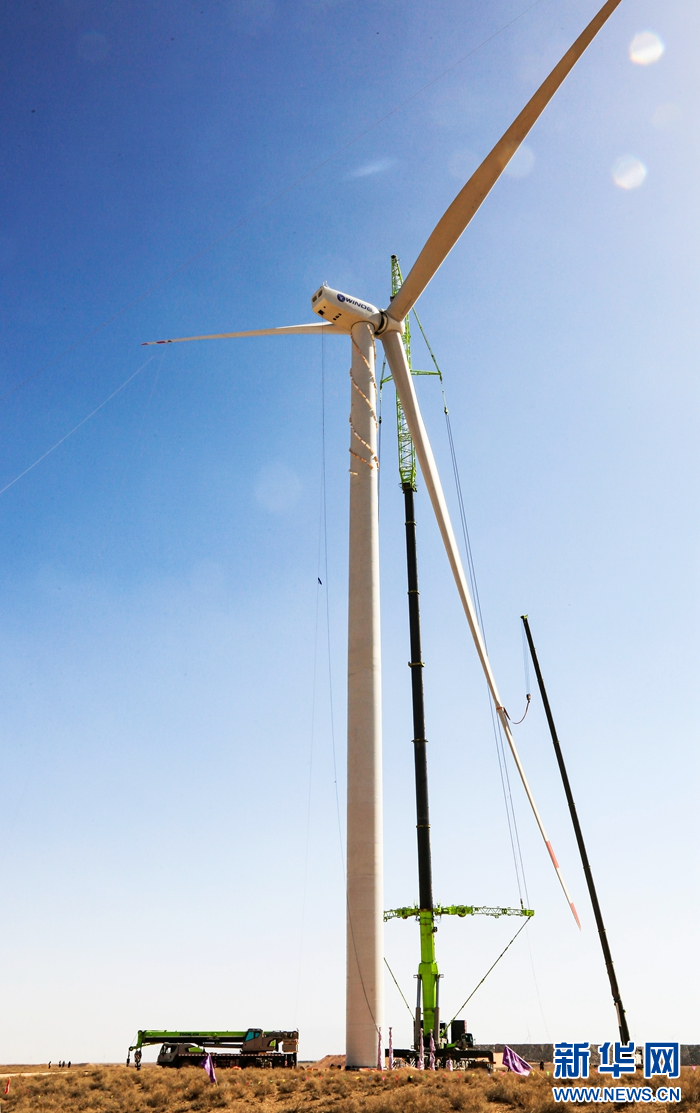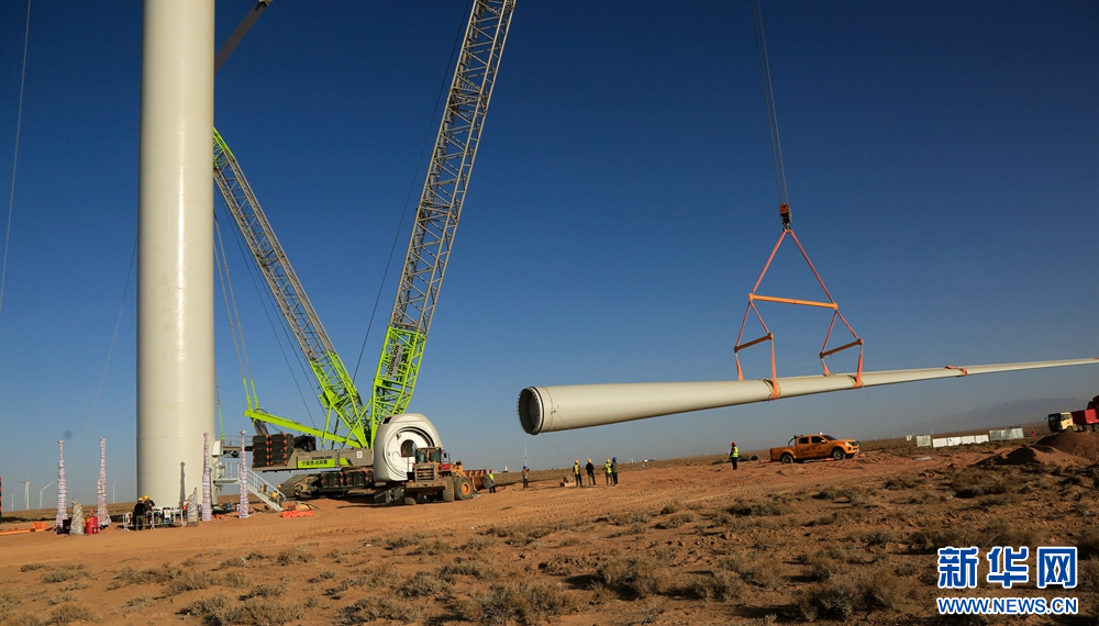 近日,在甘肅省張掖市甘州區(qū)平山湖20千瓦風電施工現(xiàn)場,工人們緊張有序地進行風電設備安裝工作。新華網發(fā)(陳禮 攝)