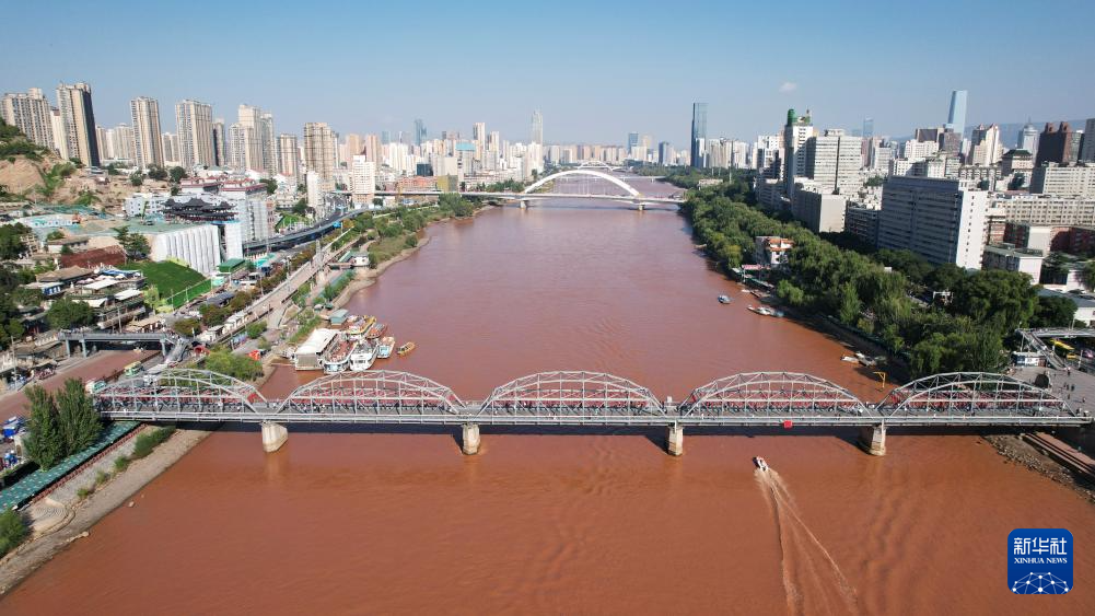 一艘快艇從黃河蘭州段中山橋下駛過(9月23日攝,無人機照片)。新華社記者陳斌攝