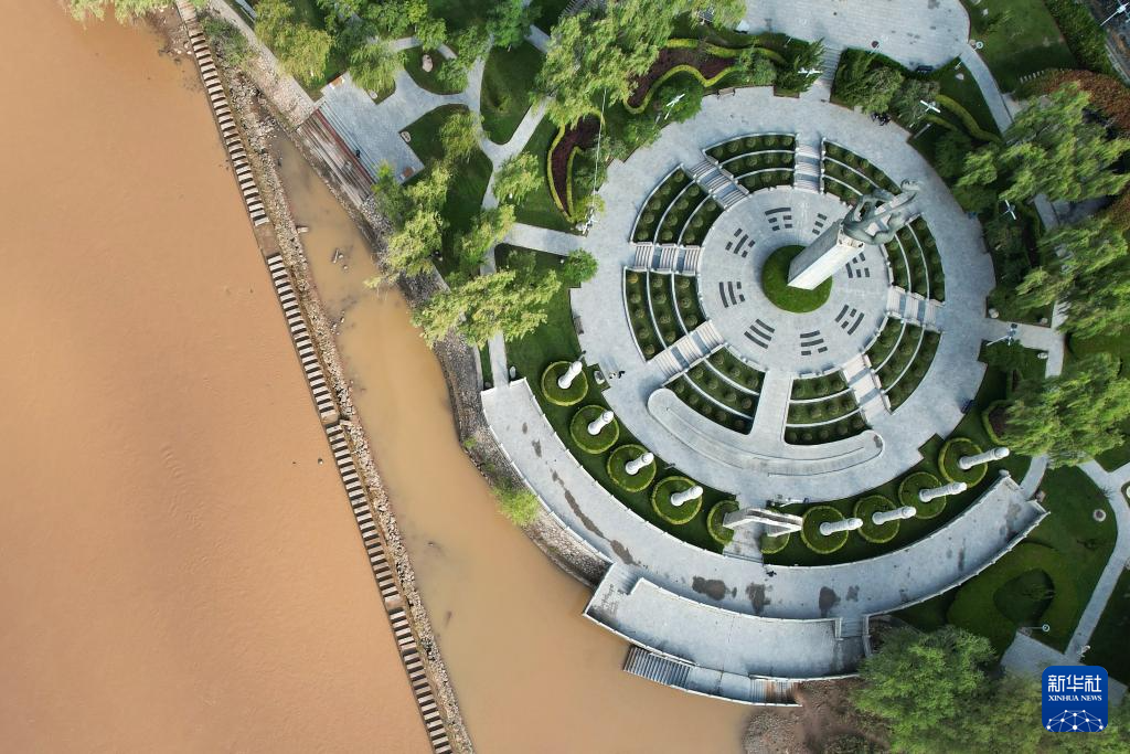 這是位于黃河蘭州段南岸的黃河樓(9月26日攝,無人機照片)。新華社記者陳斌攝