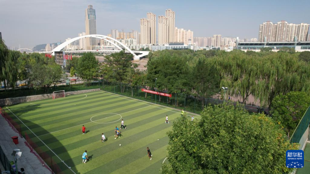 市民在位于黃河蘭州段南岸的體育公園足球場內(nèi)踢球(9月24日攝,無人機照片)。新華社記者陳斌攝