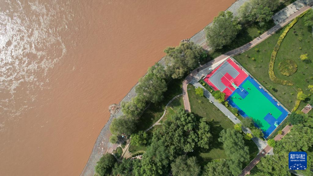 這是位于蘭州市城關區(qū)黃河北岸的蘭州馬拉松公園一處籃球場(9月24日攝,無人機照片)。新華社記者陳斌攝
