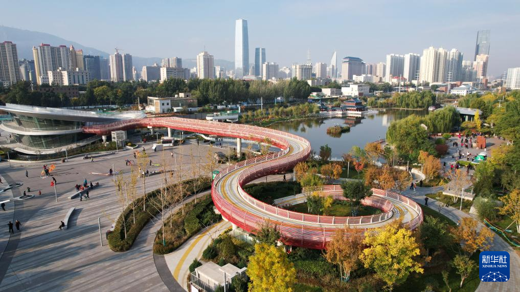這是位于蘭州市城關區(qū)黃河北岸的馬拉松公園(10月17日攝,無人機照片)。新華社記者陳斌攝