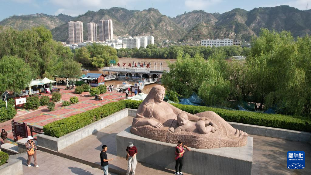 游客在位于黃河蘭州段南岸的黃河母親雕像參觀游覽(9月25日攝,無人機照片)。新華社記者陳斌攝