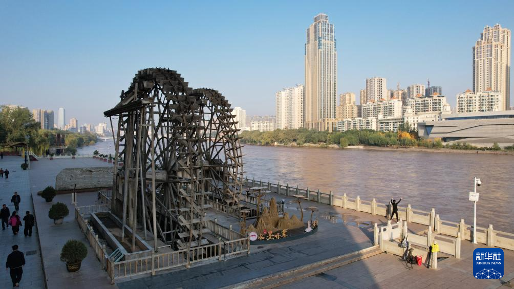 這是黃河蘭州段南岸的水車(10月17日攝,無人機照片)。新華社記者陳斌攝