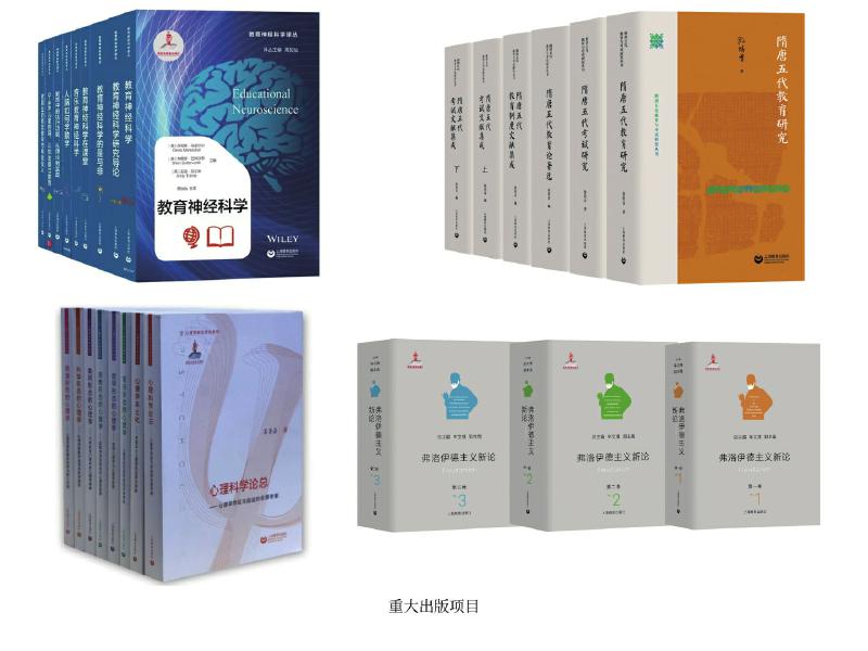 上教社密切關(guān)注新時(shí)代教育發(fā)展的重大理論問(wèn)題與現(xiàn)實(shí)問(wèn)題,響應(yīng)國(guó)家教育發(fā)展戰(zhàn)略需求,精心布局學(xué)術(shù)專(zhuān)業(yè)出版“大項(xiàng)目”,連續(xù)入選國(guó)家重點(diǎn)出版物出版規(guī)劃、2013—2025年國(guó)家辭書(shū)編纂出版規(guī)劃,獲國(guó)家出版基金資助。這其中除前文中的大型專(zhuān)科工具書(shū),還包括一系列教育與心理學(xué)原創(chuàng)研究和前沿研究成果:由中國(guó)教育史學(xué)者孫培青編著的“隋唐五代教育與考試研究叢書(shū)”,構(gòu)建了反映隋唐五代教育與考試全貌的教育理論體系和文獻(xiàn)資料體系,是中國(guó)教育史學(xué)科建設(shè)的一項(xiàng)學(xué)術(shù)文化積累工程;《中國(guó)課程史》以現(xiàn)代課程理論為分析框架,以歷史線索展現(xiàn)中國(guó)學(xué)校課程的新陳代謝;“教育神經(jīng)科學(xué)譯叢”(9冊(cè))是我國(guó)首個(gè)聚焦教育神經(jīng)科學(xué)這一國(guó)際教育研究前沿領(lǐng)域的學(xué)術(shù)譯介系列;《中國(guó)傳統(tǒng)德育心理學(xué)思想新論》系統(tǒng)挖掘整理中華優(yōu)秀傳統(tǒng)文化中蘊(yùn)含的德育心理學(xué)思想,構(gòu)建中國(guó)特色心理學(xué)話語(yǔ)體系;我國(guó)第一套以大心理學(xué)觀,從本土心理學(xué)視角系統(tǒng)探索和解讀不同形態(tài)心理學(xué)的學(xué)術(shù)系列“心理學(xué)形態(tài)研究系列”(6冊(cè)),全景考察心理學(xué)的命運(yùn)與前途,深入探索中國(guó)本土心理學(xué)的選擇與突破;《弗洛伊德主義新論》(三卷)匯聚國(guó)內(nèi)弗洛伊德主義研究領(lǐng)域的權(quán)威學(xué)者,歷史展現(xiàn)弗洛伊德理論的百年發(fā)展歷程,提供弗洛伊德主義研究的“全景圖”。這些重大出版項(xiàng)目為構(gòu)建中國(guó)特色自主知識(shí)體系,建設(shè)中國(guó)教育學(xué)和心理學(xué)學(xué)科體系、學(xué)術(shù)體系、話語(yǔ)體系發(fā)揮了重要作用。