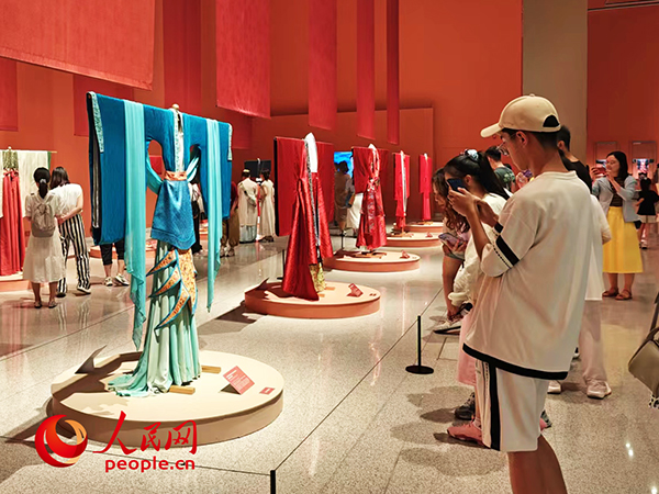 7月20日,正值周末,中國(guó)工藝美術(shù)館(中國(guó)非物質(zhì)文化遺產(chǎn)館)“五彩錦簇——中華服飾文化展”的展廳里人流如織。有人舉起手機(jī)拍照留念,有人駐足了解精湛的織造工藝,還有人在與同伴討論哪里能買到“同款”衣裝……這場(chǎng)中華服飾的視覺(jué)盛宴,讓眾多游客沉浸其中。