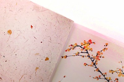 低首聞香,竹葉紙、桂花紙、蠟梅紙散發(fā)著獨(dú)有清香,在花葉紙上還能夠觸摸到真實(shí)的植物肌理;荸薺紙、無患子紙等果實(shí)紙上融入了肉眼可見的顆顆果粒;蜀葵紙、黃山欒紙、柿子紙等植物染色紙色彩繽紛,浸染著植物的天然原色;水印紙薄如蟬翼,透光可見植物圖案……摩挲間,24種花草紙有著獨(dú)屬于不同時(shí)節(jié)的味道,自然之美,蘊(yùn)蓄其中。