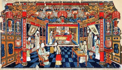 整幅年畫為我們呈現(xiàn)了一個(gè)處處燈光相映、人人語笑喧闐的祥和景象。畫中人物采用中國繪畫技法,線描敷色均呈現(xiàn)平面化特征,而居室空間則采用在清代稱為“線法畫”的技法,借鑒西方焦點(diǎn)透視法,使畫面產(chǎn)生立體感,將觀者的目光緩緩引入熱鬧溫馨的場(chǎng)景之中。