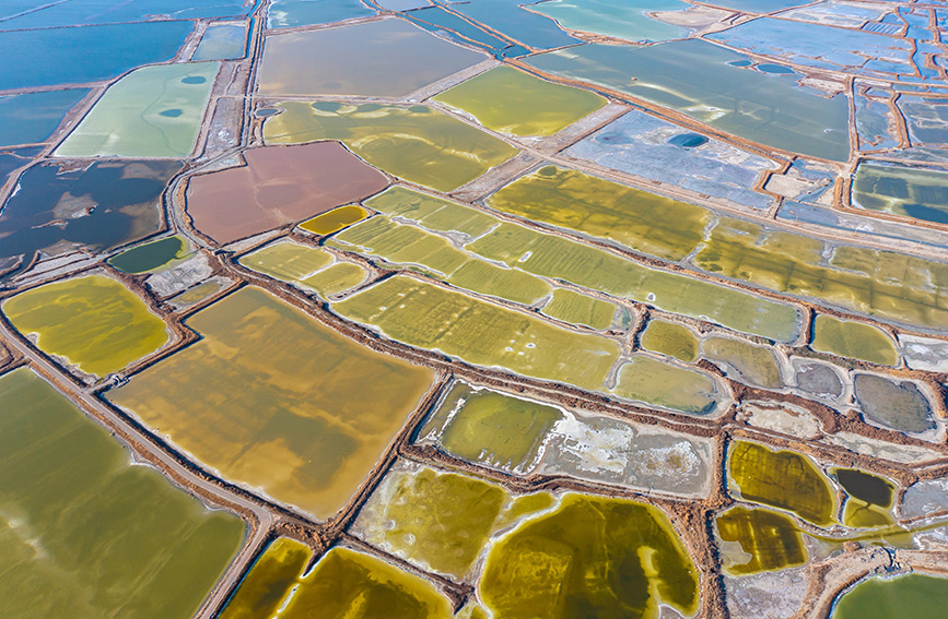 冬日時(shí)節(jié),隨著氣溫降低,山西運(yùn)城鹽湖湖面上,色彩斑斕、景色如畫。芒硝結(jié)晶,“硝花”似雪,鹽湖里各種線條和幾何圖案,猶如大自然的調(diào)色盤,十分迷人。