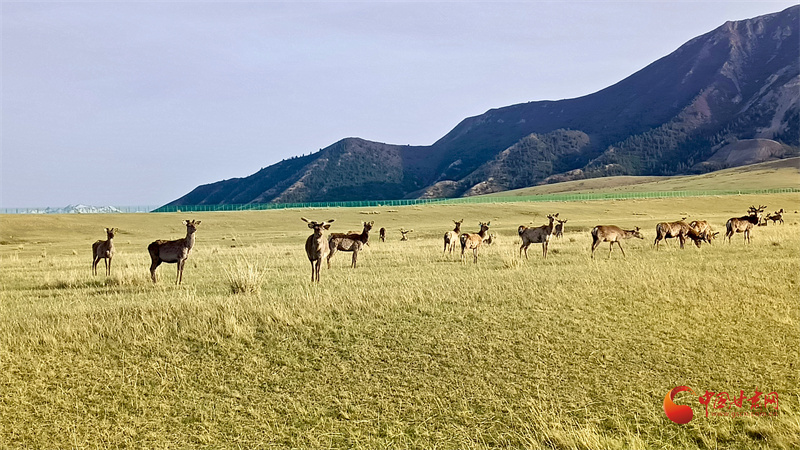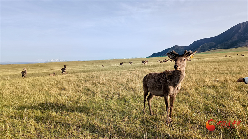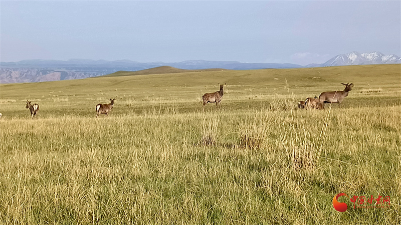 初夏的肅南大河草原牧草逐漸返青,一群群馬鹿在草原上悠閑覓食,游客到來(lái)并沒有打擾它們的正常活動(dòng)。