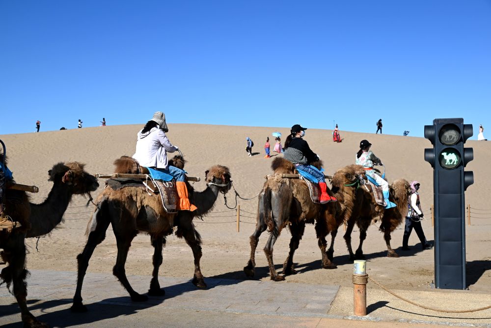 5月24日,敦煌市鳴沙山月牙泉景區(qū)的交通信號(hào)燈“綠駱駝燈”亮起時(shí),農(nóng)戶牽著駱駝?dòng)行蛲ㄟ^。敦煌市鳴沙山月牙泉景區(qū)設(shè)置具有駱駝元素的交通信號(hào)燈,保障了景區(qū)交通安全順暢。新華社發(fā)(張曉亮攝)