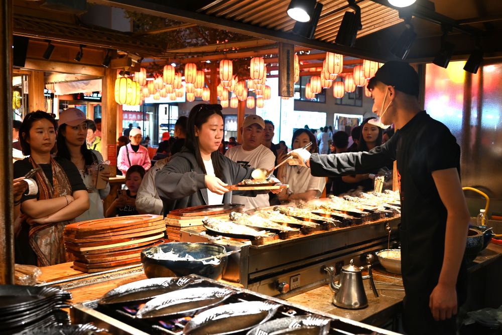 5月24日晚,游客在敦煌夜市沙州食驛選購(gòu)美食。新華社發(fā)(張曉亮攝)