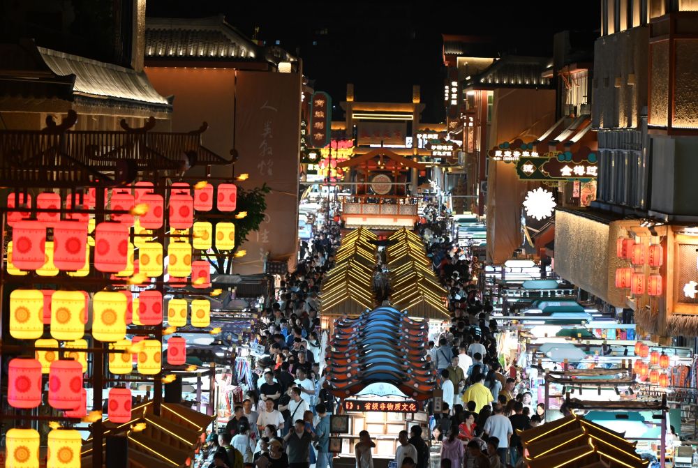 5月24日晚,游客在敦煌夜市商業(yè)街游覽。新華社發(fā)(張曉亮攝)