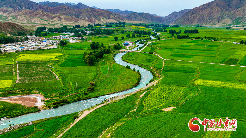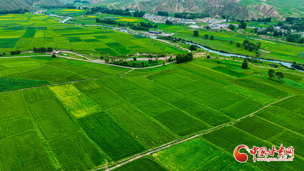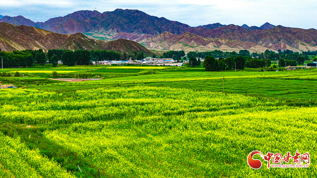 7月14日,一場小雨過后,張掖市肅南裕固族自治縣皇城鎮(zhèn)泱翔片區(qū),萬畝麥田泛黃、油菜花盛開如金。微風(fēng)吹拂,麥浪翻涌花香浮動(dòng)。遠(yuǎn)眺祁連山巍峨聳立,近觀民居錯(cuò)落有致,構(gòu)成一幅和諧的畫卷。