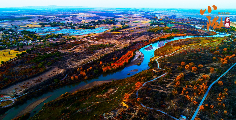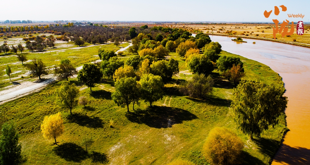 金色胡楊在陽(yáng)光下泛著溫暖光澤,斑斕絢麗的蘆葦如金色絲帶點(diǎn)綴荒漠,與碧綠河水、湛藍(lán)天空構(gòu)成濃墨重彩的秋日?qǐng)D景。